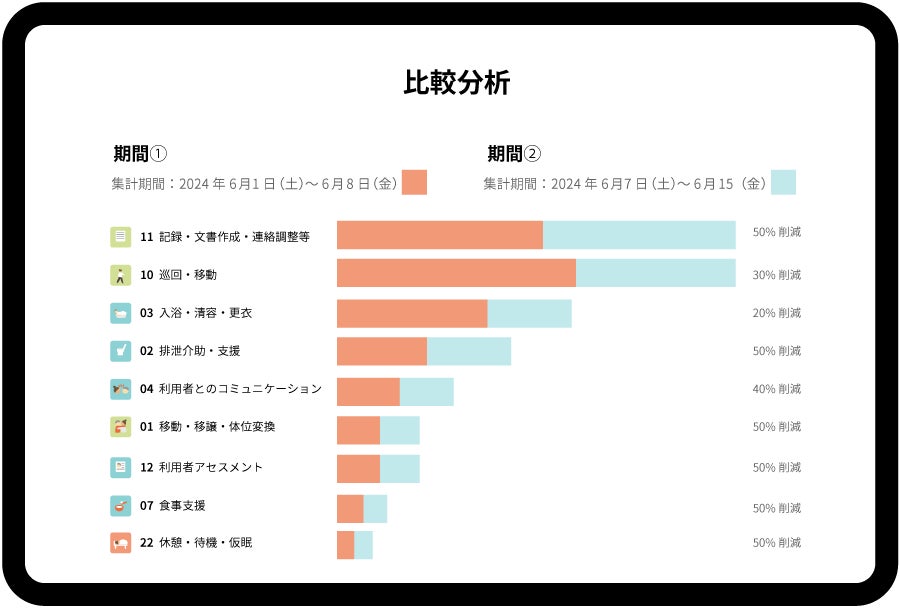 ハカルトを導入した介護サービス事業所は、生産性向上推進体制加算の取得及び特定施設等における人員配置基準の特例的な柔軟化を容易になることから、ハカルトのタイムスタディを通した業務分析の結果を用いて、見守り機器他、介護テクノロジーの導入を加速させることができます。