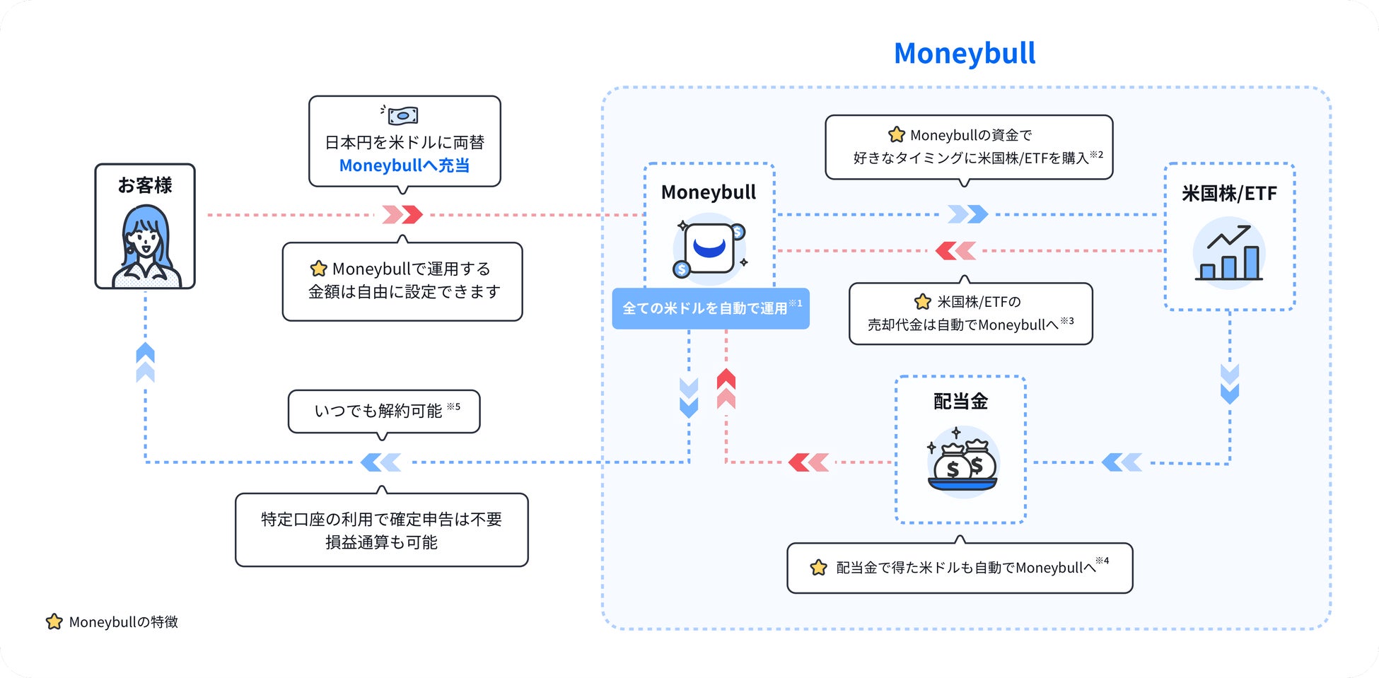 またMoneybullの資金は、米国株や米国ETFの買付余力となります。さらに、米国株や米国ETFの売却代金や配当金から得た米ドルも、手続き不要で自動的にMoneybullへ充当され運用されます。