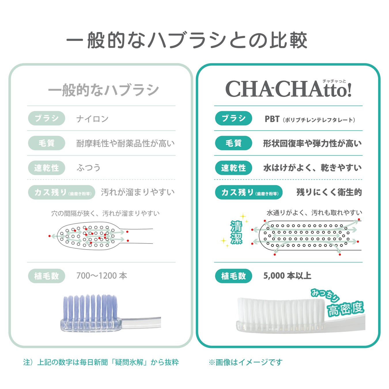 一般的な歯ブラシが約700~1,200本の毛束であるのに対し、『CHA-CHAtto』は5,000本以上の非常に密度が高いブラシ毛を使用しています。一度のブラッシングで広範囲に毛先が届き、歯の表面の汚れを素早く、確実に取り除きます。また舌のケアにも役立つ万能な設計です。