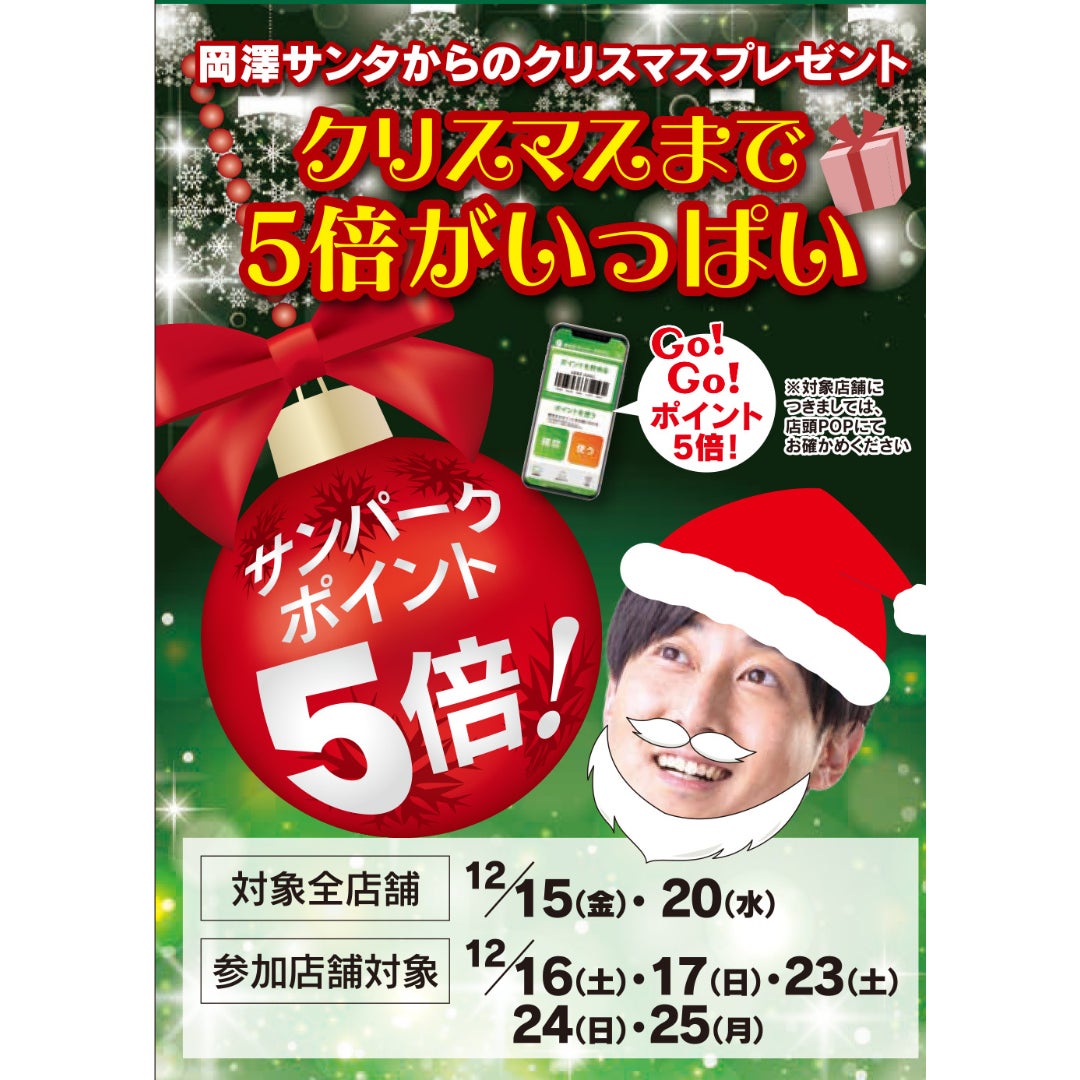 クリスマスまで、おのだサンパーク公式アンバサダー岡澤サンタからのクリスマスプレゼント!クリスマスまでサンパークポイントが対象店舗にて5倍付与されます。お客様にお得にお買い物をお楽しみくださ