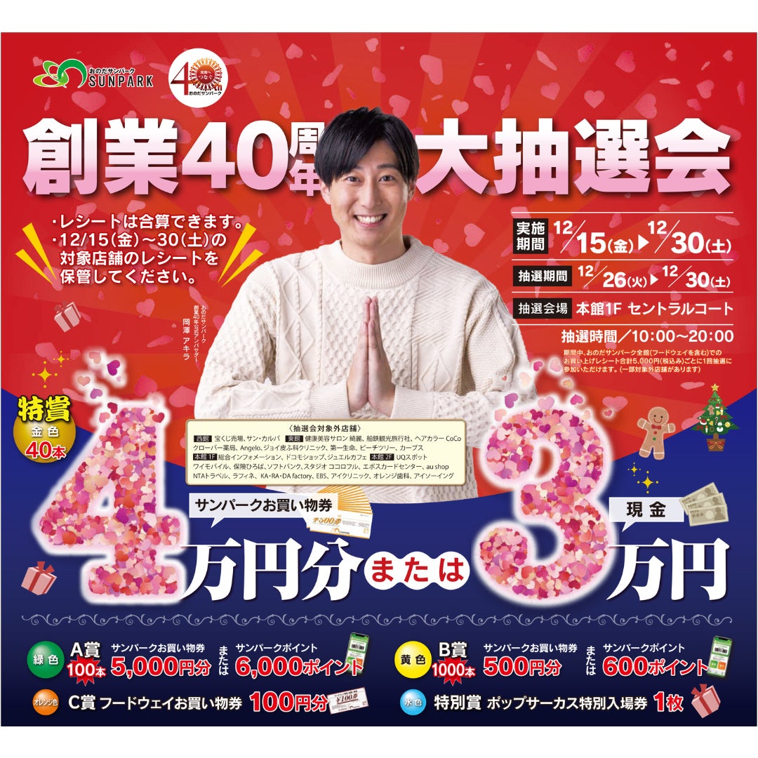 山口県を拠点に展開する富士商グループホールディングス株式会社(本社:山口県山陽小野田市稲荷町10-23 代表取締役:藤田 敏彦)複合商業施設「おのだサンパーク」(運営会社:小野田商業開発株式会社)は、創業40周年を迎え、お客様への感謝の気持ちを込めて年末に特別なイベントを開催いたします。