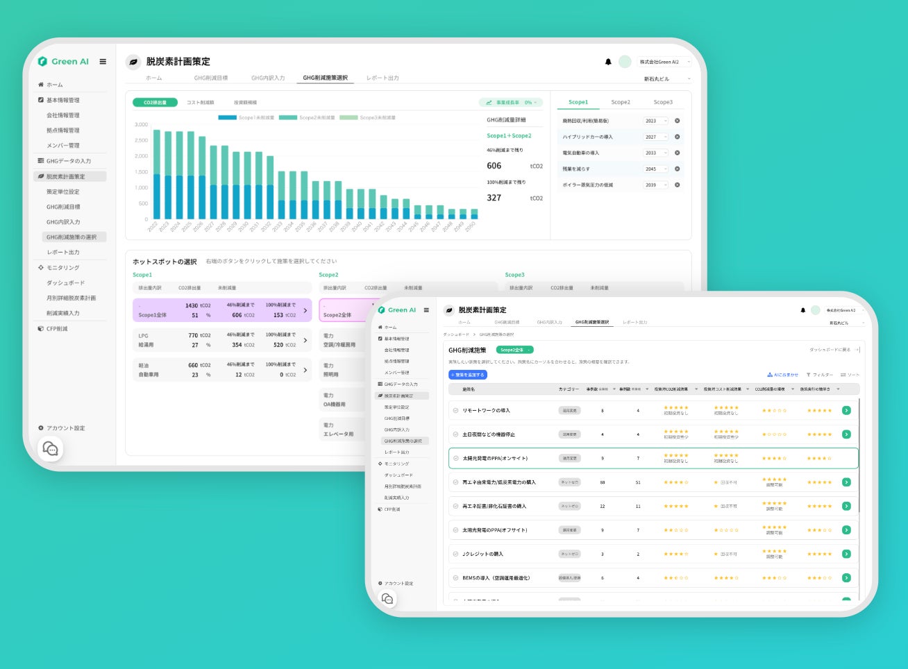 脱炭素計画策定サービス「Green AI」は300以上のCO2削減施策から、ユーザーの排出状況に合わせてAIがレコメンド。さらにCO2削減量、投資回収年数などを計算。脱炭素計画策定をサポートすることで企業の『脱炭素』と『コスト削減』の両立を実現するシステムです。