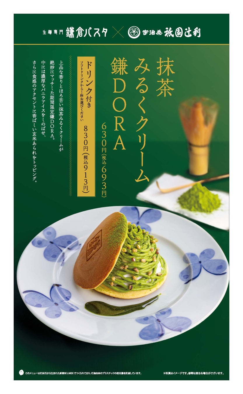 鎌倉パスタ×祇園辻利コラボ 期間限定コラボレーションメニューとして、「抹茶みるくクリーム 鎌DORA」を3月6日から販売