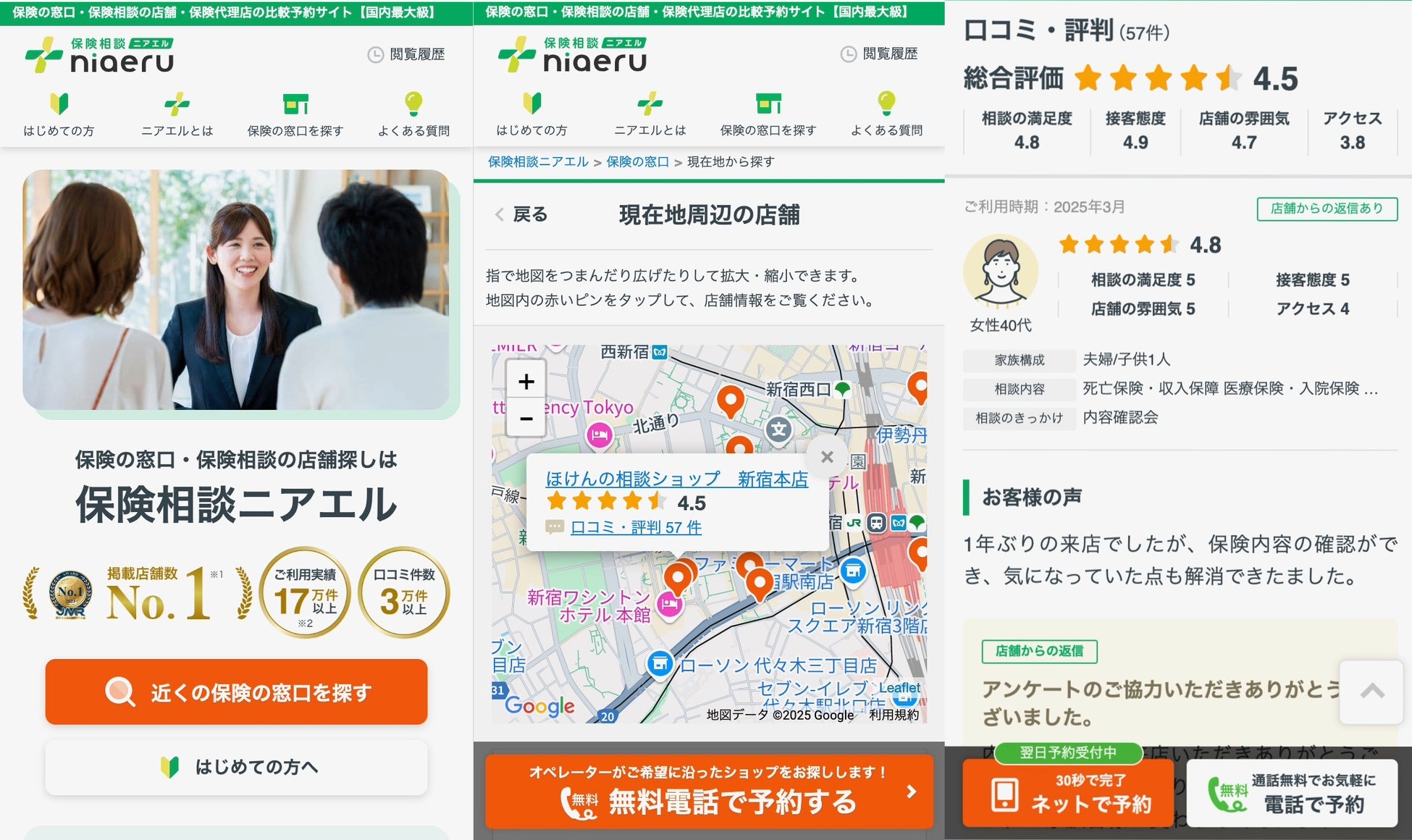「保険相談ニアエル」は、掲載店舗数 1,700 店以上の保険ショップ検索・予約サイトです。