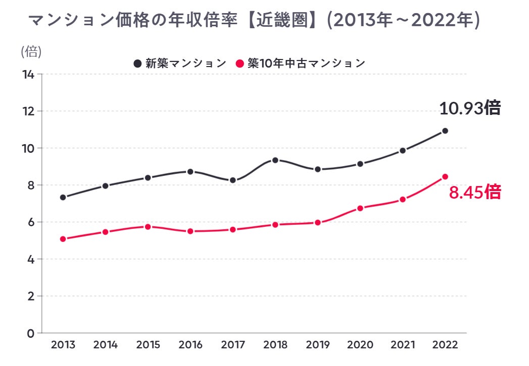 近年の建築労務費・建築資材の原価高騰などを受けて新築分譲マンションの供給減少や価格高騰が続く中、新築・中古マンション購入の年収倍率は首都圏で11~12倍、近畿圏でも8~10倍と10年前と比べて+3~5ポイント高くなり、生活者にとってより高い買い物になってきています。