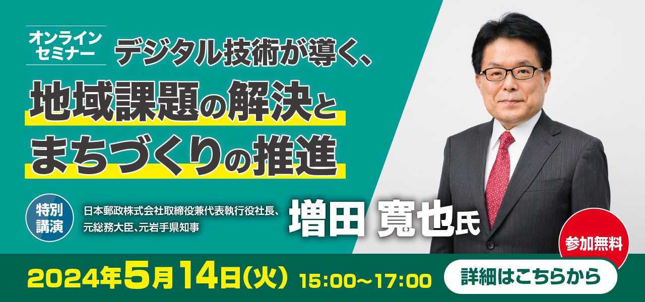 国は、デジタル田園都市構想など地方創生にあらたな動きをしています。そのなかで地方活性化を図るには、地方の経済・社会に密接に関係するさまざまな分野において、デジタルの力を活用し、社会課題の解決や魅力向上を図ることが必要です。今回は、デジタルをどう使って地方の課題が解決できるのかを基調講演として現場第一線からNTTアーバンソリューションズの上野 晋一郎 氏に、そして、人口減少にどう立ち向かうのかを特別講演として「このままでは全国896の地方自治体が消滅する可能性がある」(2014年 日本創成会議 通称:増田リポート)で注目を集めた増田 寛也 氏に講演していただきます。古くて新しい地方創生。地域課題をデジタルでどう解決できるのかを学びませんか。 みなさまのお申し込みをお待ちしております。