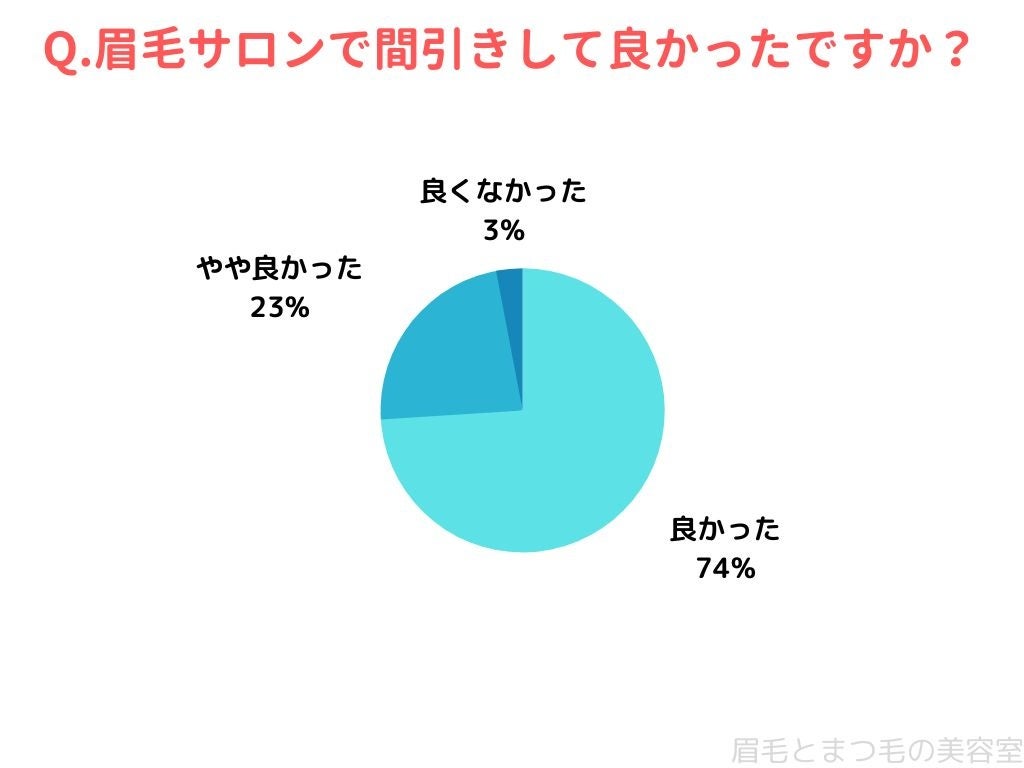 眉毛サロンで間引きをした人に”良かったか”とお尋ねしたところ「良かった(74%)」、「やや良かった(23%)」、「良くなかった(3%)」ということが分かりました。