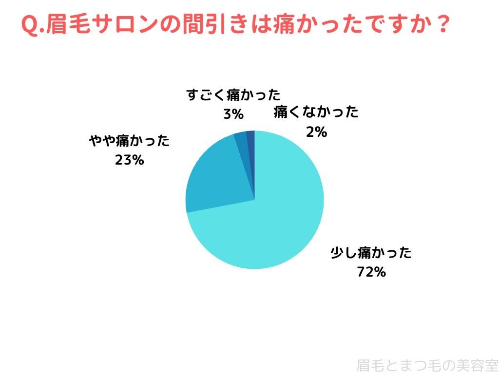 眉毛サロンの間引きを受けた人に痛かったかお聞きしたところ「少し痛かった(72%)」、「やや痛かった(23%)」、「すごく痛かった(3%)」、「痛くなかった(2%)」という結果になりました。