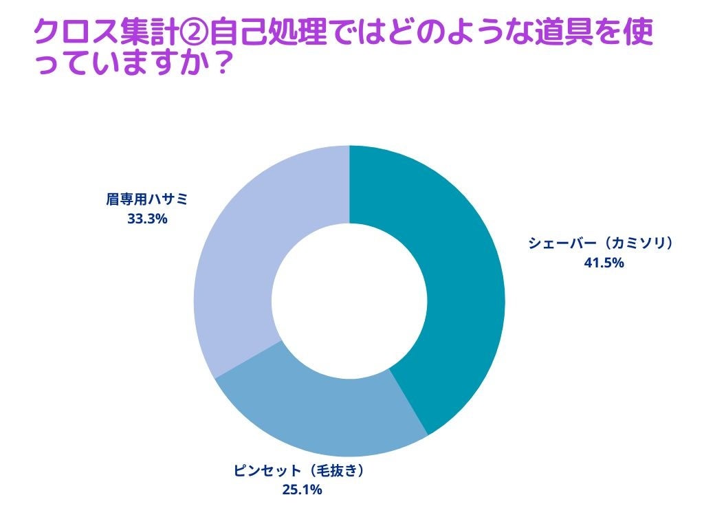 どのように自己処理をしているかお聞きしたところ「シェーバー[カミソリ](41.5%)」、「ピンセット[毛抜き](25.1%)」、「眉専用ハサミ(33.3%)」という結果になりました。