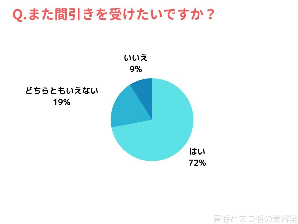 眉毛サロンで間引きをまた受けたいと回答された人は「はい(72%)」、「どちらともいえない(19%)、「いいえ(9%)」という結果になりました。