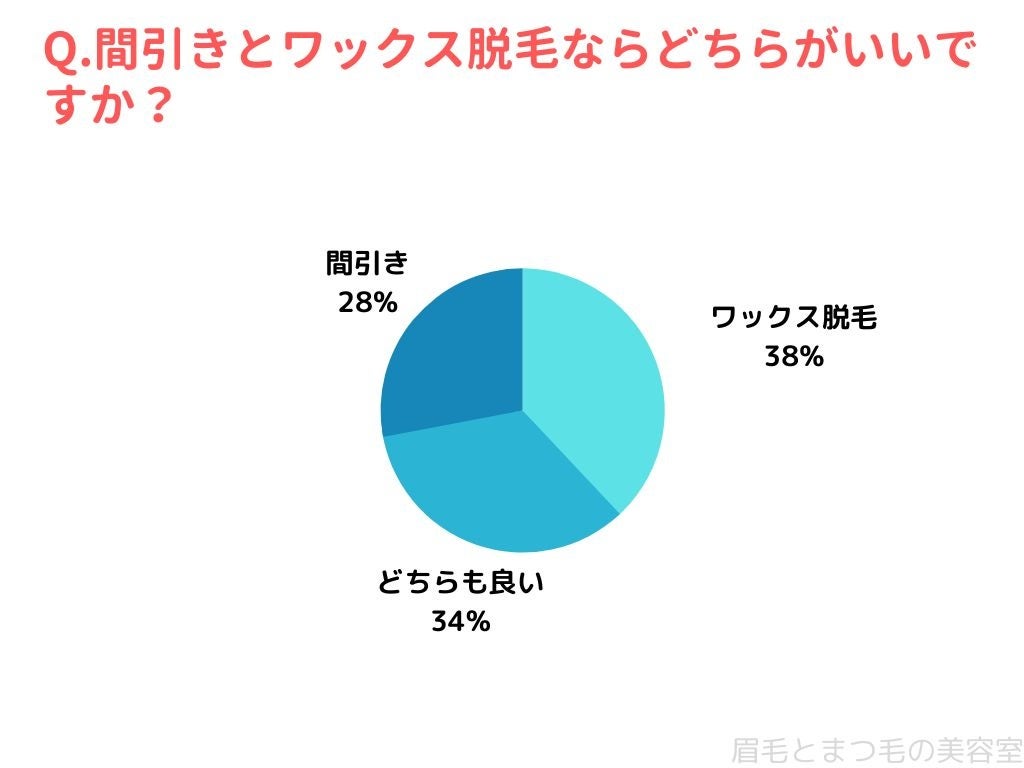 眉毛サロンで施術を受けるとき”間引き”と”ワックス脱毛”どちらが良いかとお聞きしたところ「ワックス脱毛(38%)」、「どちらも良い(34%)」、「間引き(28%)」ということが分かりました。