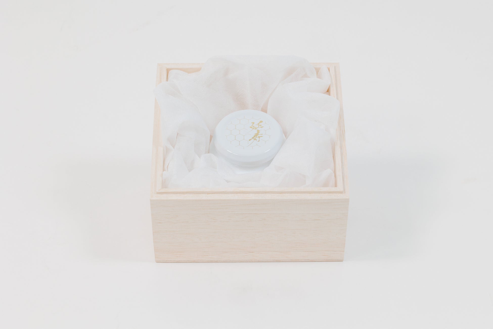 1段目には専用の木製スプーン、2段目には白い瓶に入ったはちみつが収められており、人里離れた山奥からの特別な贈り物を思わせるデザインです。
