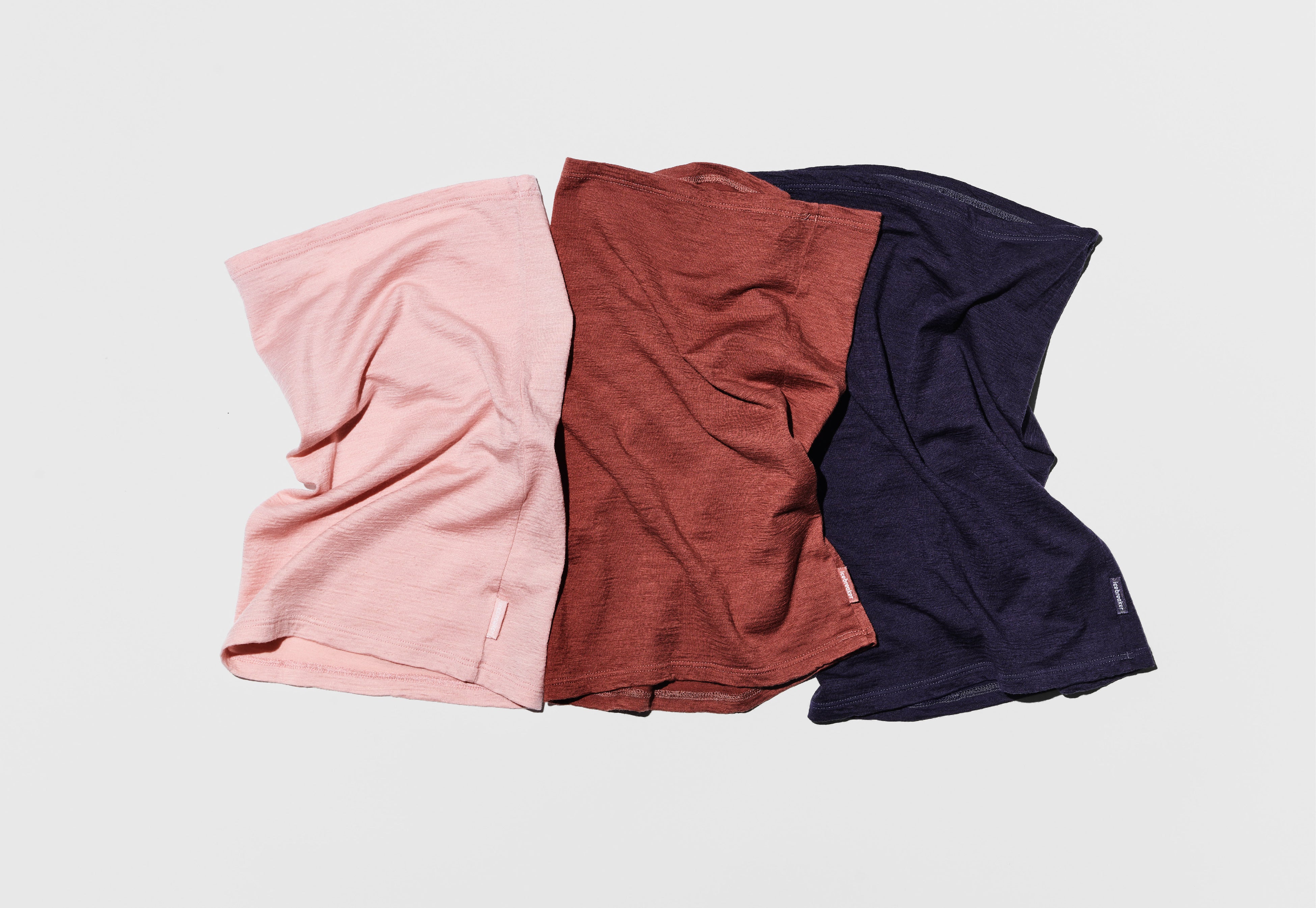 チューブ型のネックゲーターは、フェイスガードやヘッドウエアなどフレキシブルな使い方ができます。肌に直接触れてもチクチクしないやさしい着け心地が特徴です。暑いときは涼しく、寒いときは暖かく保つ温度調節機能に加え、長時間の使用でもニオイが気になりにくい天然の消臭効果を備えています。