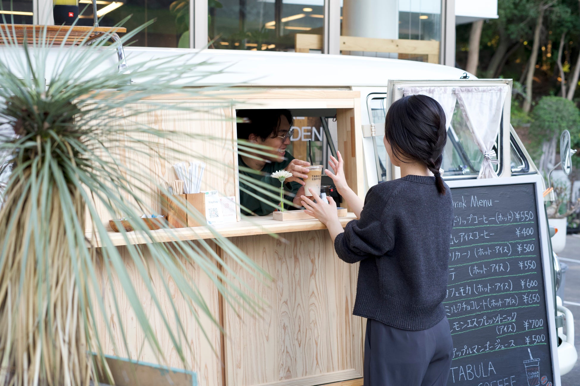 TABULA COFFEE TRUCKではドリンク、店舗のオープン後はドリンクやフードに加えて、花や観葉植物を楽しめる空間をお楽しみください。