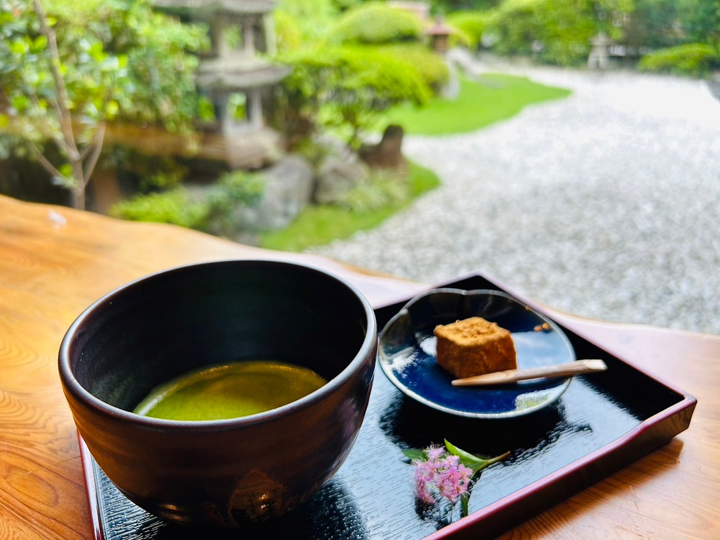 にて、ウェルカムドリンクの抹茶もしくはスパークリングワインと和菓子で旅の疲れを癒します。