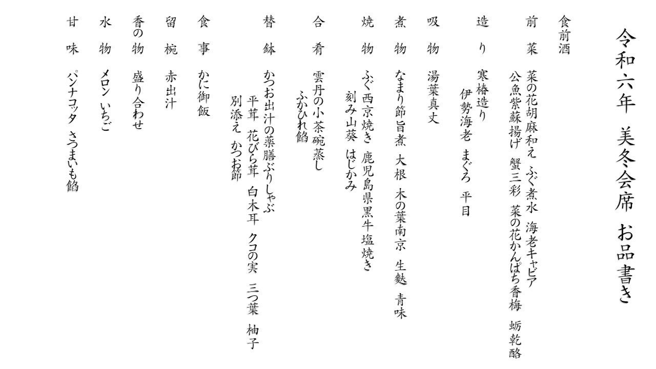 2024年の美冬会席は調理長松尾が和食の基本であります、出汁にこだわった心温まる会席となっております。五感で出汁を感じる技法で、鹿児島県指宿の料理宿らしい山と海の食材をふんだんに使用した料理を是非ご堪能下さい。