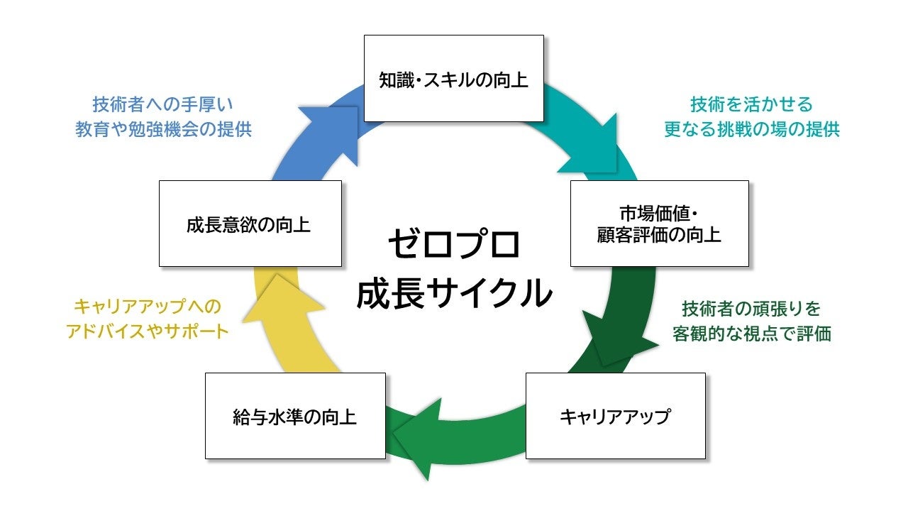 当社は、「潜在能力をプロへと開花させる『成長体験』を、すべての人へ。」というミッションを掲げておりますが、このミッションの実現に向けて、技術社員が継続的に成長できる環境の構築を目指し、未経験者でも、着実にプロへと成長していくプロセスを「ゼロプロ成長サイクル」と定めました。