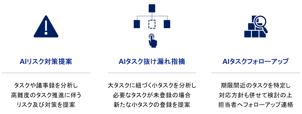 AIリスク対策提案やAIタスク抜け漏れ指摘は、プロジェクト背景や全タスクの進捗状況を踏まえて実行