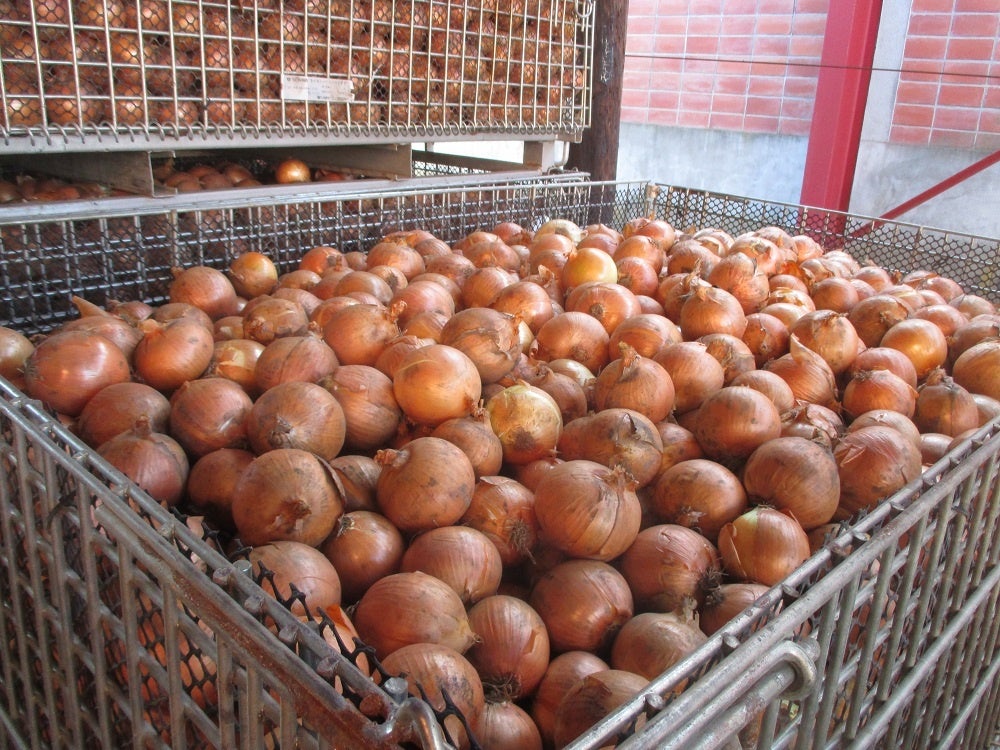 生産者が収穫したたまねぎは大型の鉄製コンテナ(通称「大コン」(読み:おおこん))に詰めて風乾され、その後、農協等の選果場に運び込まれます。主に使われている大コンは縦118cm×横179.5cm×高さ132.2cmで、重さは約120kg。約1.2tのたまねぎが収納できます。