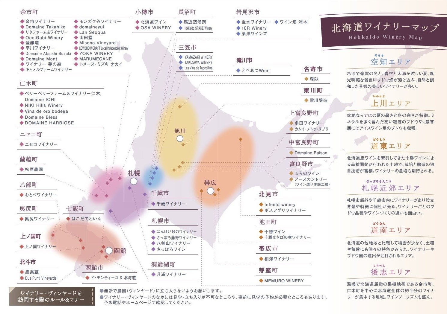 道内のワイナリーは、後志や空知など醸造用専用のぶどう品種の作付が多い地域を中心に所在。近年、ワイン用ぶどうの栽培可能な地域が広がってきたことなどを背景に、道内のワイナリー数は急増し、2024年2月末現在で64か所と10年前の約3倍近くまで増加※。