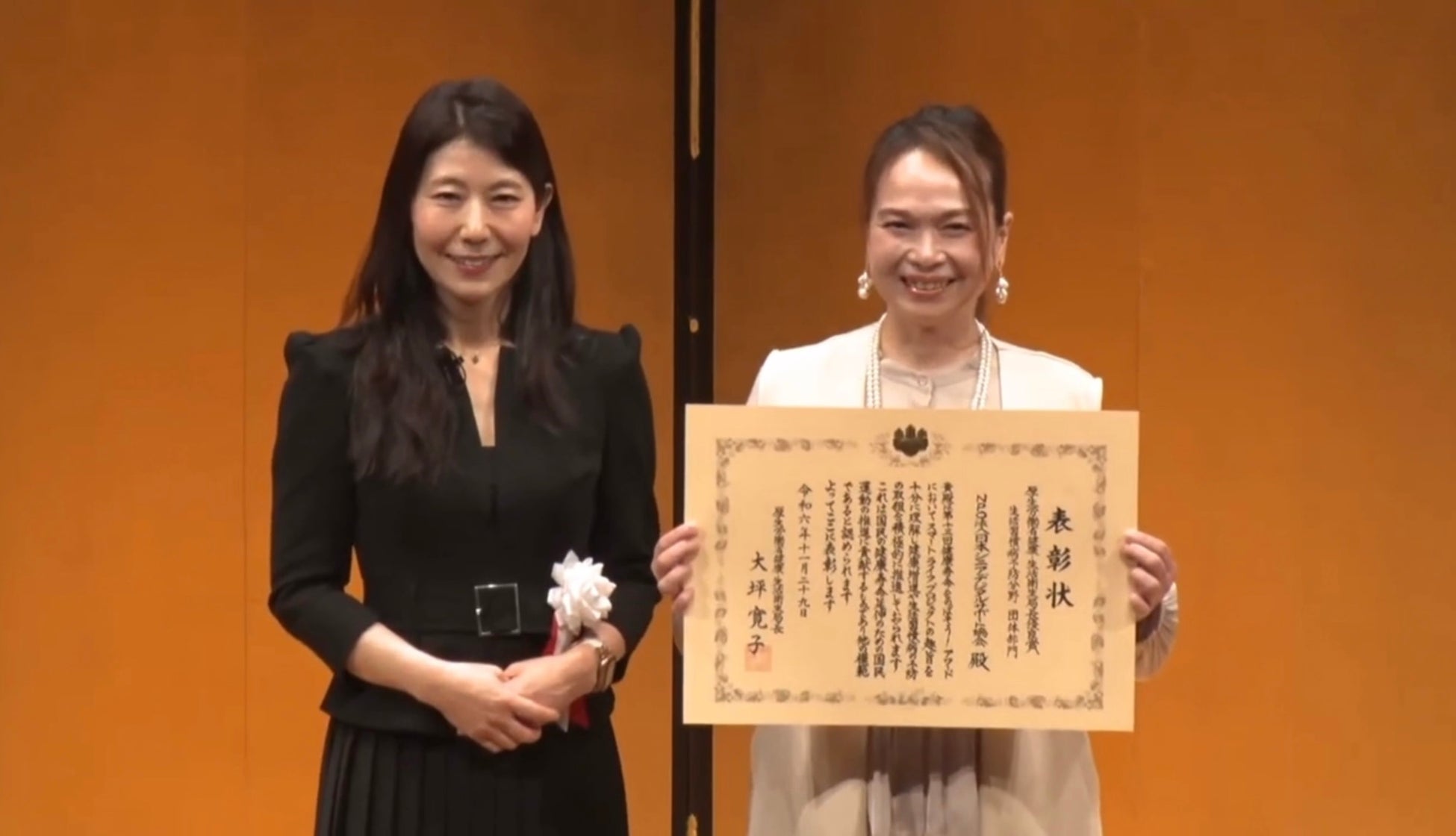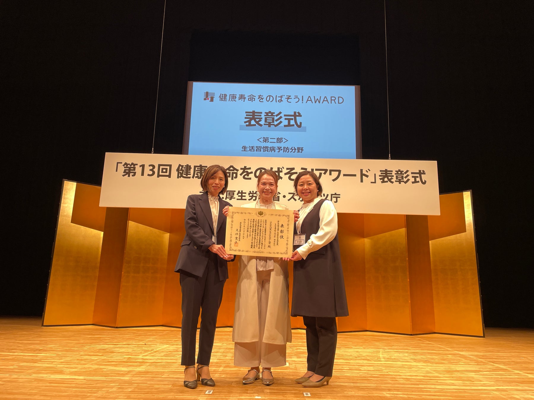厚生労働省及びスポーツ庁は「第13回健康寿命をのばそう!アワード」の表彰式を令和6年11月29日(金)に日経ホール(千代田区)で開催しました。113の応募の中から選ばれた当団体は厚生労働省健康・生活衛生局長の大坪寛子氏より優良賞を授与されました。