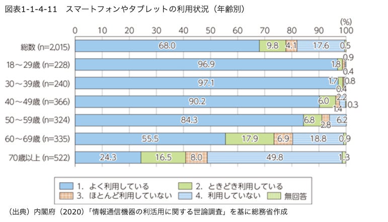 内閣府による調査では「70才以上のスマホ活用率」は40.8% 「スマホ所持者だが使う用途が分からない」は42.4%とのデータがあります。