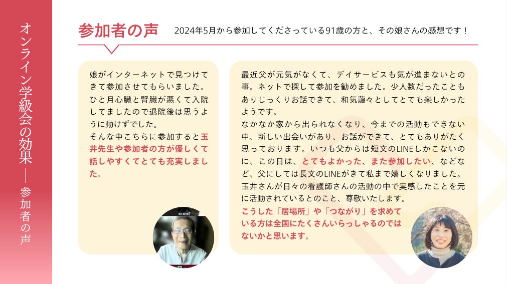 訪問看護師として働いていた際に、外出が困難となり社会的つながりを失う高齢者を多く見てきました。外出が困難になり、社会的なつながりを失うことで精神的な不安や孤独感を抱え、「早くあの世に行きたい」と願いながら急激に身体機能が低下し、医療や介護の依存度が増す悪循環を目の当たりにしました。この問題を解決するために、自宅にいながら他者と交流し、楽しみを持てる場が必要だと強く感じました。自宅や施設にいながらでも安心して社会参加できる場を提供するために「オンライン学級会」を開始しました。
