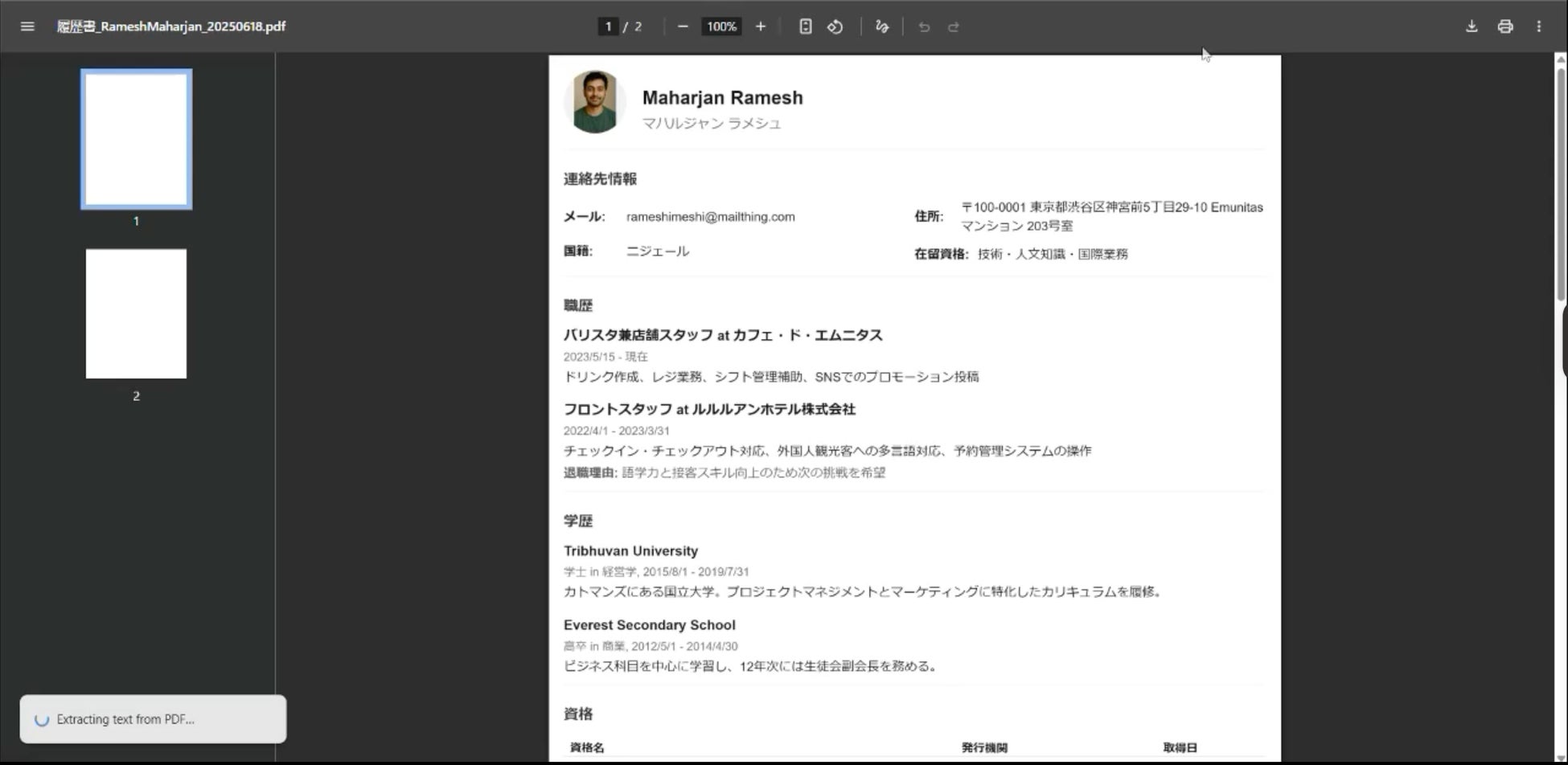 証明書、退職理由、日本語力を反映した「説得力ある履歴書」を1クリックで作成。 誰でも「読み手に届く書類」を簡単に生成できます。