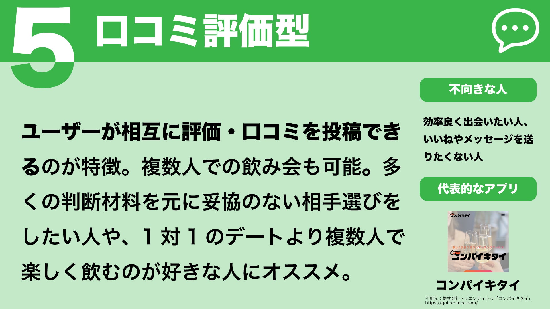 代表的な第5世代のマッチングアプリには、「コンパイキタイ」などがあります。