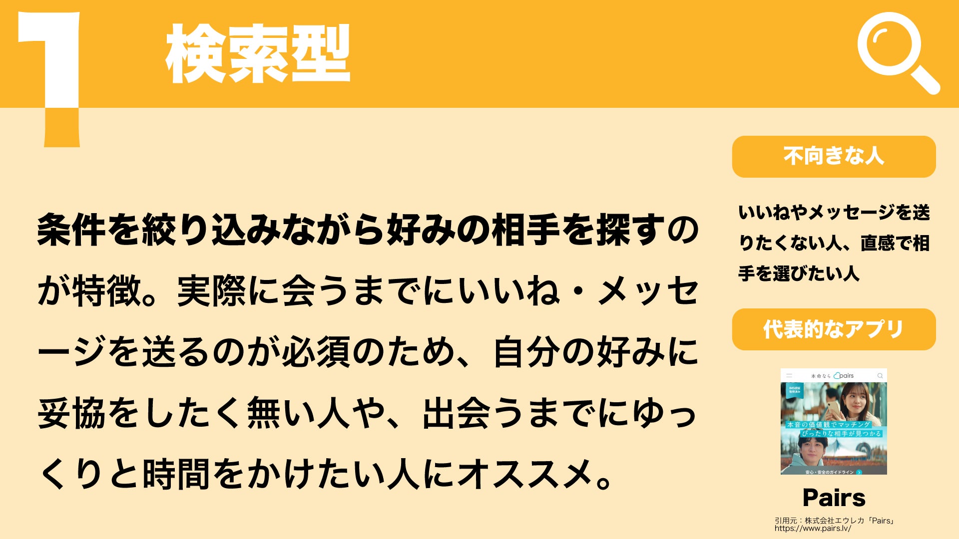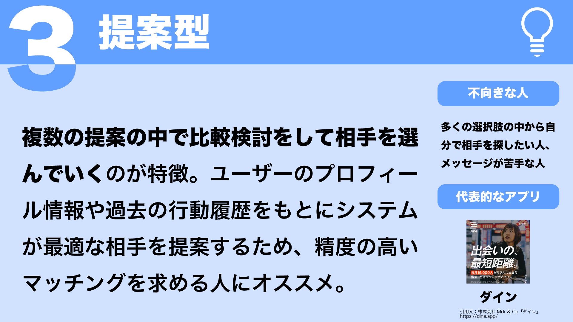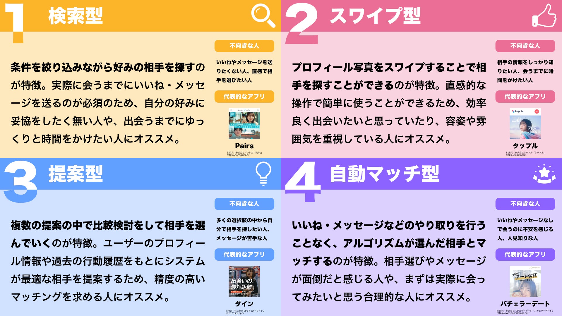 2022年頃までは、第1世代「検索型」、第2世代「スワイプ型」、第3世代「提案型」、第4世代「自動マッチ型」の4つに分類されていました。