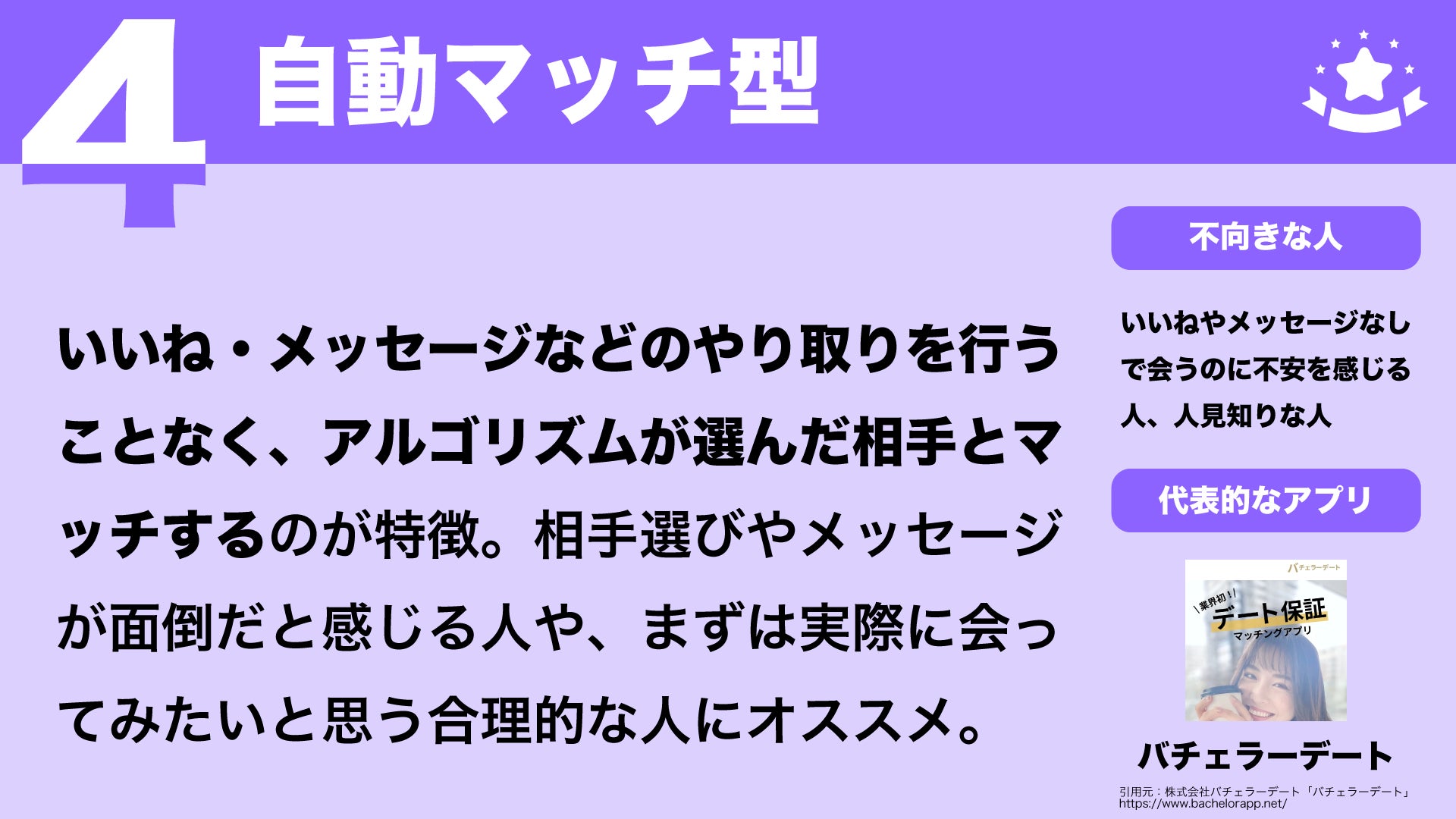 第4世代のマッチングアプリでは、いいね・メッセージなどのやり取りを行うことなく、アルゴリズムが選んだ相手とマッチします。