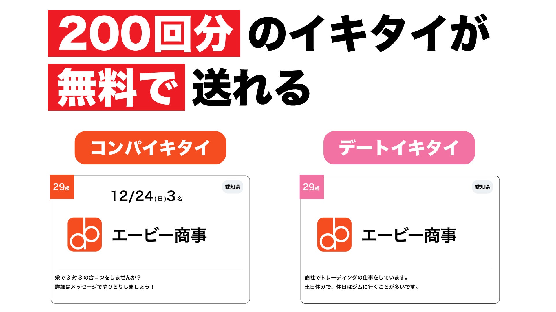 審査を通過したユーザーは、複数人の合コンを行いたい場合は「コンパイキタイ」、1対1のデートを行いたい場合は「デートイキタイ」をお相手に送ることができます。