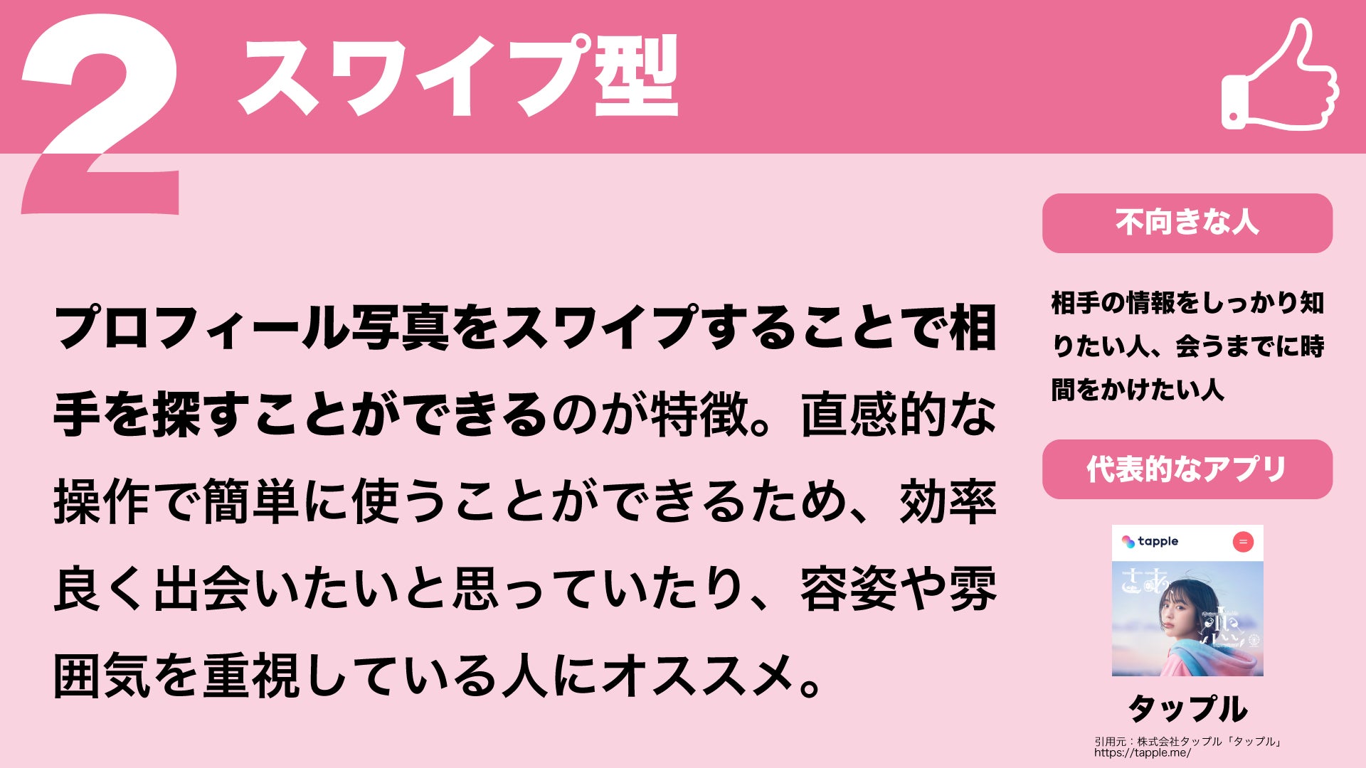 第2世代のマッチングアプリでは、プロフィール写真をスワイプすることで、直感的に相手を選ぶことができます。