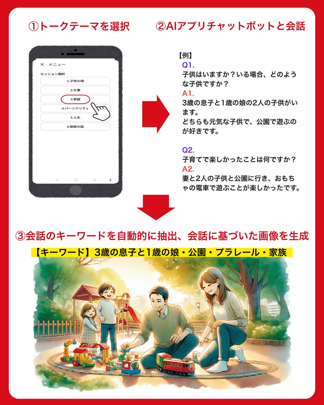 本アプリは、ユーザーの記憶やエピソードをAIが対話形式で聞き取り、物語として再構成。さらに、内容に応じたイメージイラストを自動生成することで、心のケアや医療従事者とのコミュニケーションをサポートします。