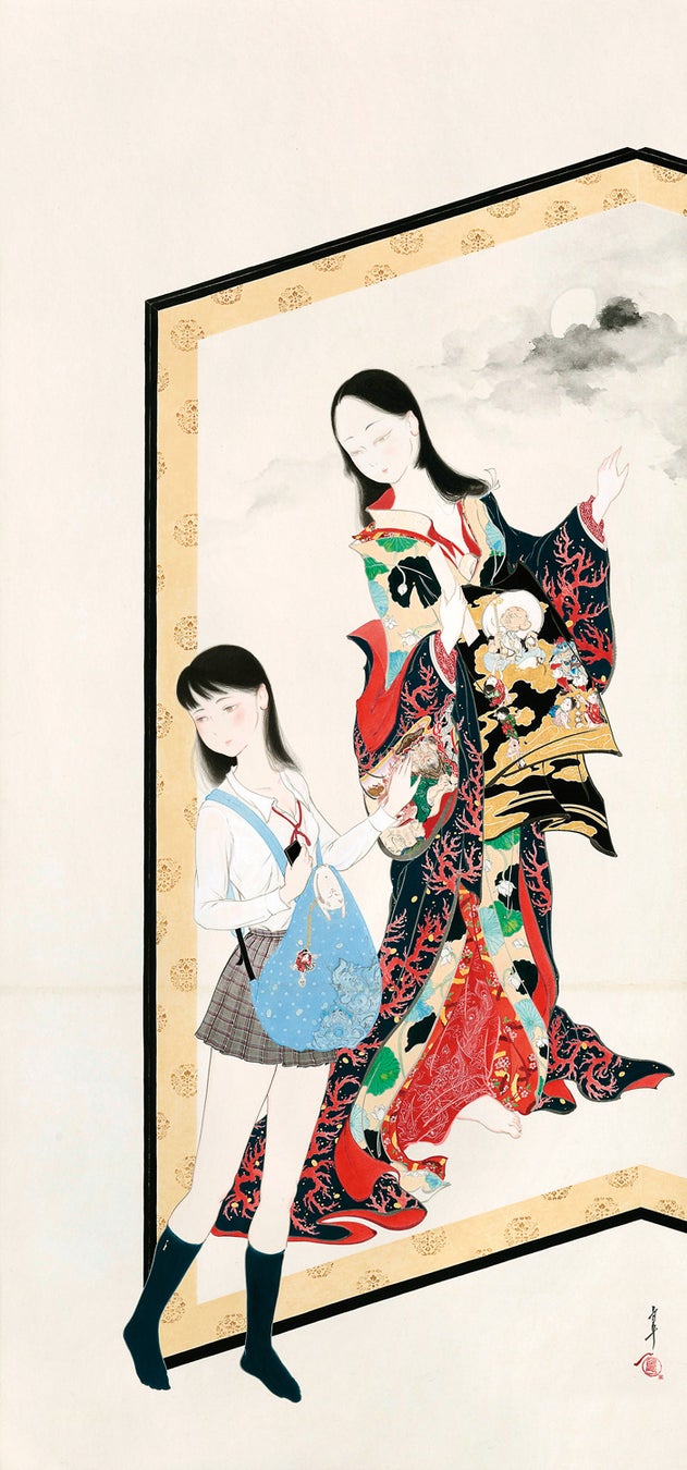 もって少女や妖怪、八百万の神々、おかめなどを描いていきます。現実と虚構が