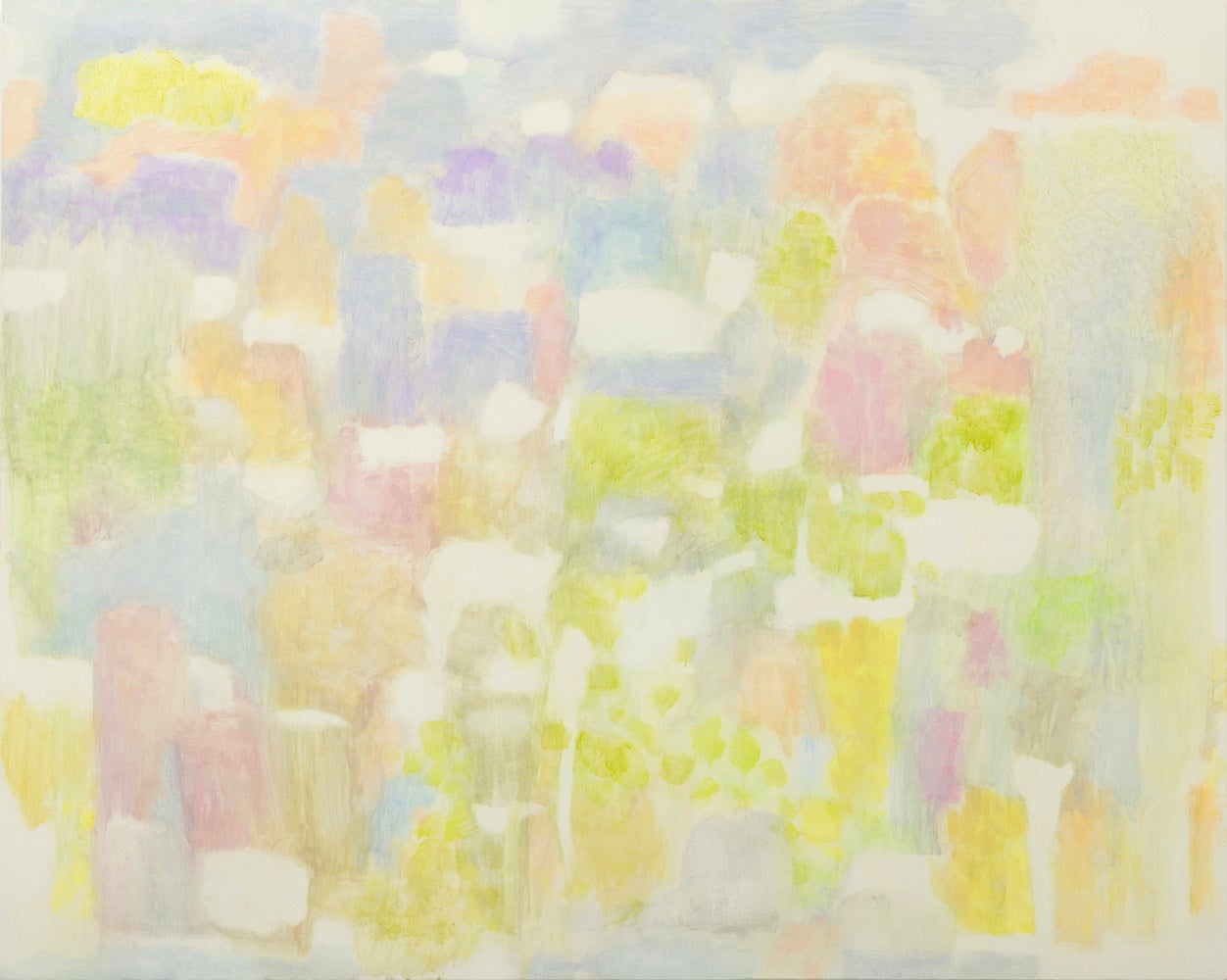 徳永陶子(とくながとうこ)は、「記憶」と「プロセス」をテーマに制作を続けています。感覚の奥深くに沈んだ色とかたちを拾い集め、記憶のかけらが積層し作品に溶け込んでいく画面を、コットンキャンバスにフラッシュ(ビニル絵具)を重ねていくことで模索していきます。