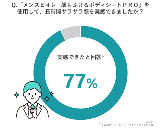 多くのビジネスパーソンが直面する「くり返す汗・ベタつき」の悩みに応えるため、花王株式会社は「メンズビオレ 顔もふけるボディシートPRO」を発売しました。調査に併せて、ホテルスタッフに同商品を一定期間使用してもらい、実際の現場で使用していただきました。その結果、ホテルスタッフの77%※5が「長時間、サラサラ感を実感」と回答しました。