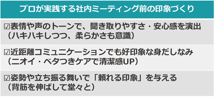 社内コミュニケーションにおいても、印象づくりは信頼関係を築くうえで欠かせません。たとえば朝礼や定例ミーティングなど、ちょっとした会話の中でも、「清潔感がある人」「きちんと整えている人」という印象は、周囲の信頼や評価につながります。日常の場面こそ、見えない身だしなみケアを習慣化することが、職場での存在感や信頼感を高める第一歩です。