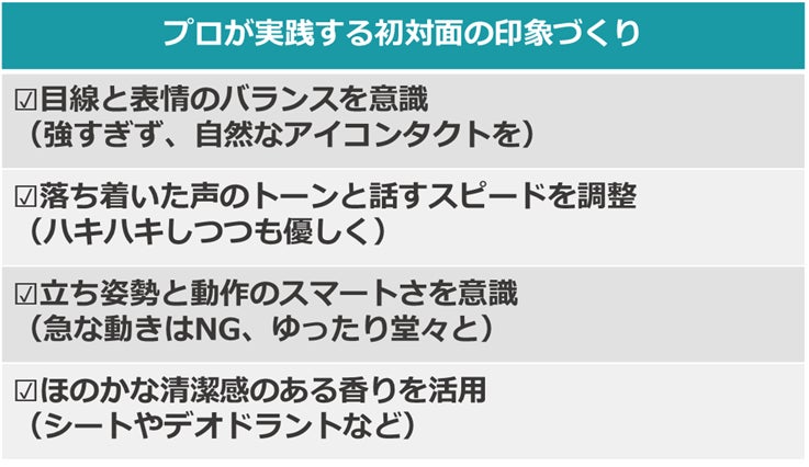 第一印象は、見た目の清潔感だけでなく、相手が無意識に感じ取る要素によっても決まります。「目線」「声のトーン」「姿勢」「ニオイ」など、細かなポイントが印象を左右するため、初対面の場面では、見えない身だしなみを意識して整えることが大切です。