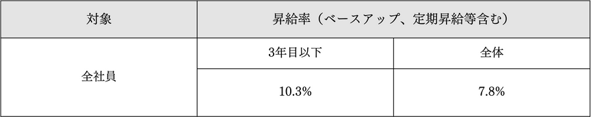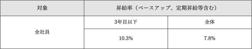 ベースアップと定期昇給等を含めた引き上げ幅は、3年目以下の若手社員は10.3%、全体で平均7.8%程度となります。