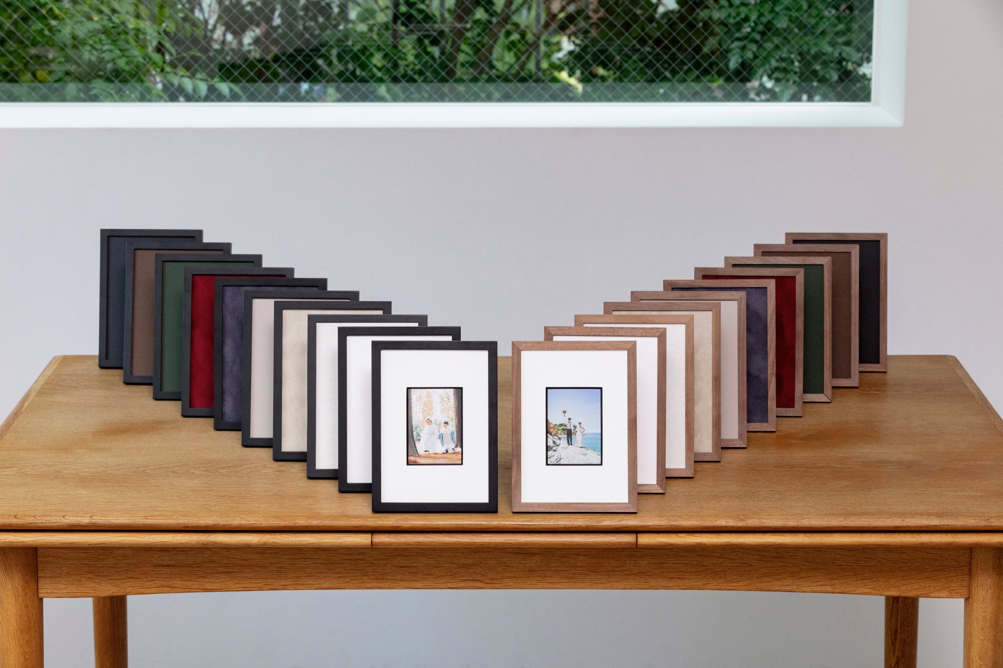 素材やカラーの異なる10種類のマット台紙と2色の木製フレームを組み合わせた20パターンから写真にぴったりな額装を選べます。サイト上でマット台紙とフレームを組み合わせて写真と重ねて試せる、マットフィッティングができ、完成イメージを確認した上で注文できます。