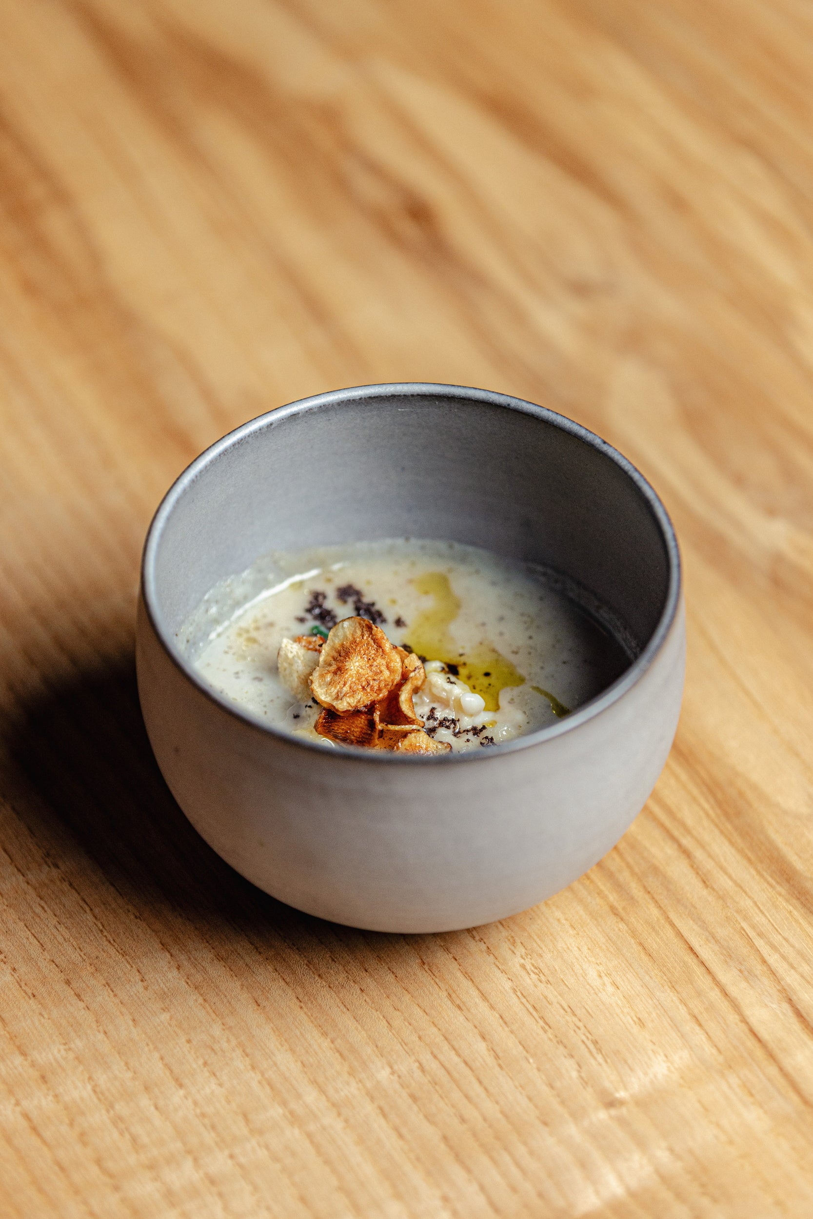 ほうじ茶とチョコレートを合わせた期間限定カクテル。ほのかな苦みと渋み、それらを引き立たせる絶妙な甘さ。雪にインスピレーションを得たミルクの泡と、ドライベリーでクリスマスを表現しました。