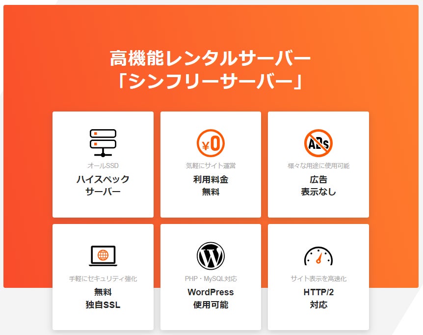 このたび提供を開始した有料プラン「シンフリーサーバープラス」は、オールSSD高速ハイスペックサーバーや無料独自SSLなど、従来の『シンフリーサーバー』の機能に加えて、以下の特長があります。