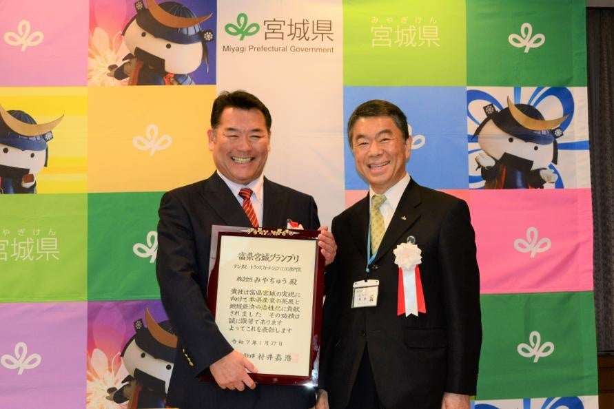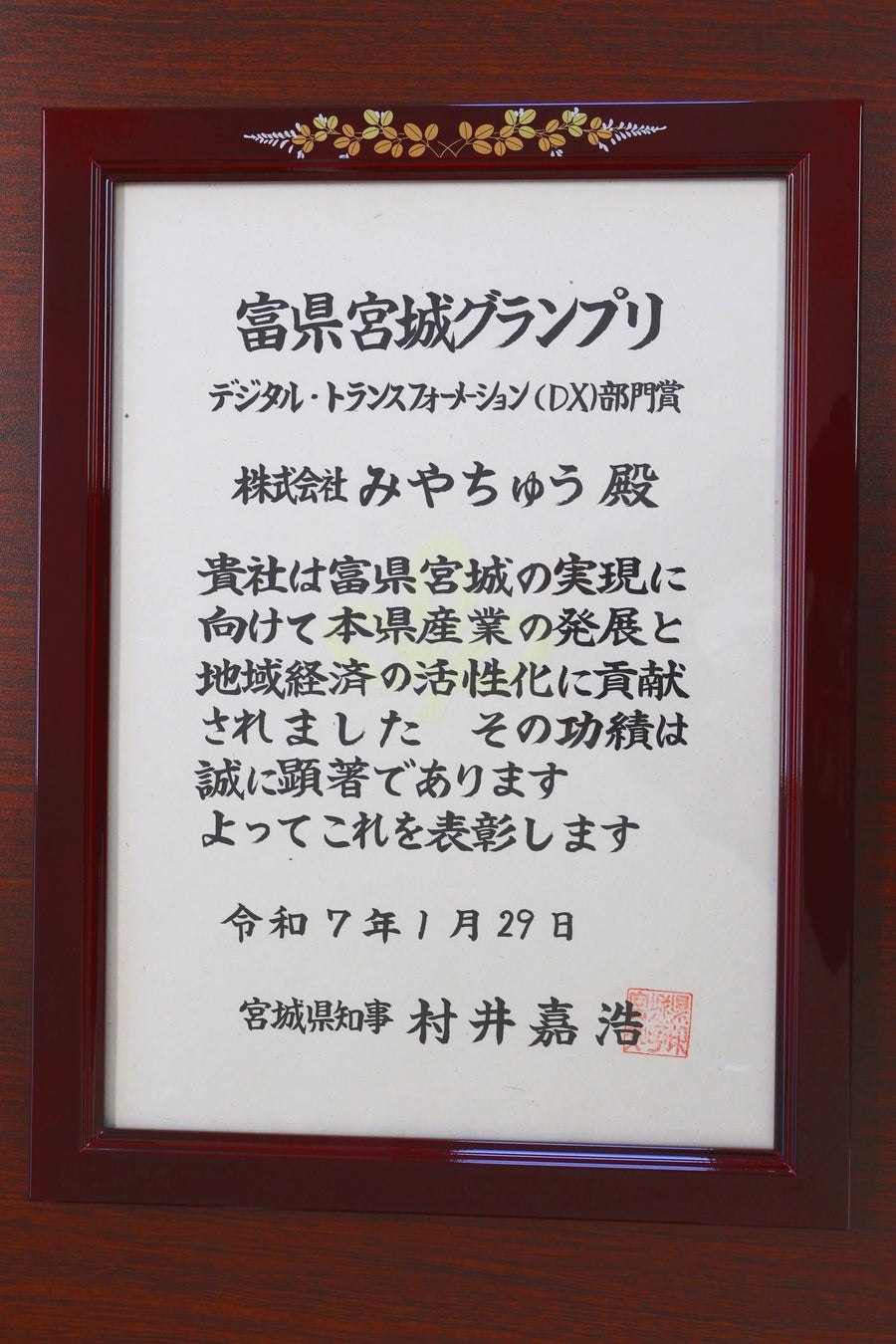 株式会社みやちゅう(代表取締役 菊池圭吾 本社:仙台市若林区)では、第13回「富県宮城グランプリ」(DX部門賞) を受賞しました。1月29日に、宮城県庁にて表彰式が行われ、宮城県知事から弊社代表取締役の菊池へ褒状が授与されました。