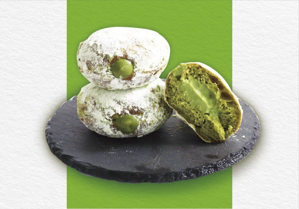 抹茶づくしのダブル抹茶マラサダは、マラサダ生地と自家製カスタードクリームに八女抹茶を使用。