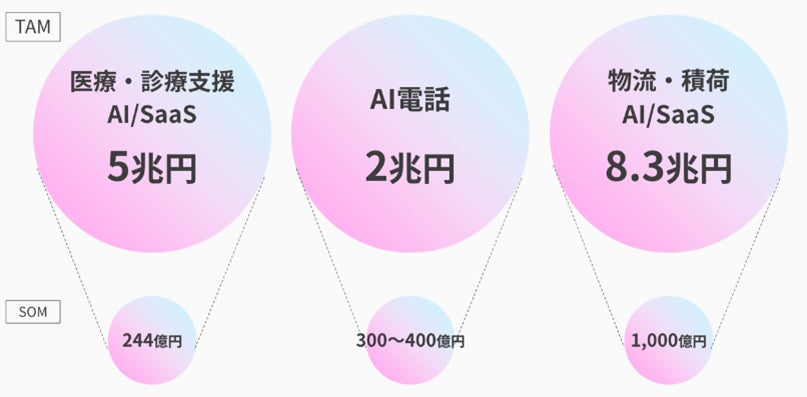 キュラルミのリリースに留まらず、現在特に注力しているのはAI電話によるコールセンターの負担軽減や、物流AI/SaaSによる配送効率化の分野です。市場規模(TAM)は合わせて15兆円にのぼります。他にも、AIやSaaSによって業務効率が行えるさまざまな場面にてサービスを企画しています。