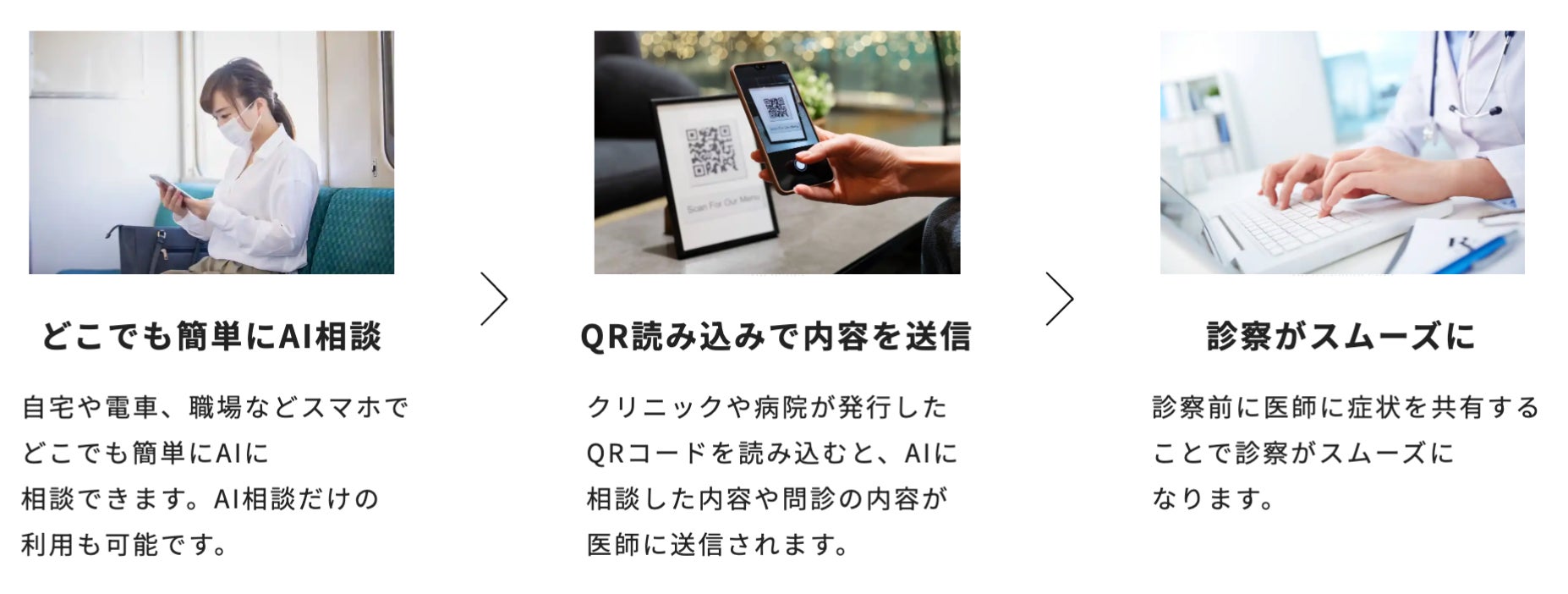 生成AIを活用し、スマホで症状をAIにいつでも相談できるWEBサービスで、クリニックや病院が発行したQRコードを読み込むと、AIに相談した内容や問診内容が医師に送信されます。キュラルミへの症状に関する相談は完全無料で行えます。
