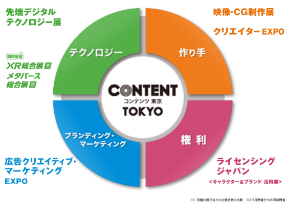 コンテンツ東京は、コンテンツ制作、映像・動画・CG制作・広告デザイン・ブランディング、コンテンツマーケティング、権利、IT、最先端の表現・体験ソリューションなどが出展。メディア、エンターテイメントや企業の宣伝・マーケティング部門の方々と直接商談ができる展示会です。