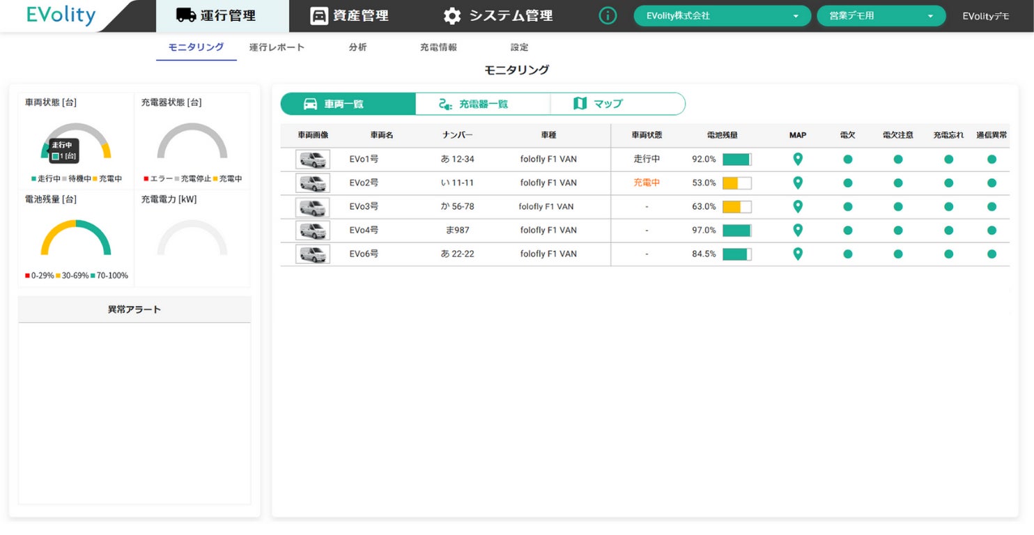 EVolityは自社開発のフリートマネジメントシステムで運用管理を支援するパートナーとして参画します。同システムでは車両の電池残量や走行距離などを常時モニタリングし、CO2排出削減量や燃料費削減量を数値化することでEV導入効果を可視化します。さらに、遠隔での車両管理や充電マネジメントによって成田空港におけるEVの運用効率を高めます。