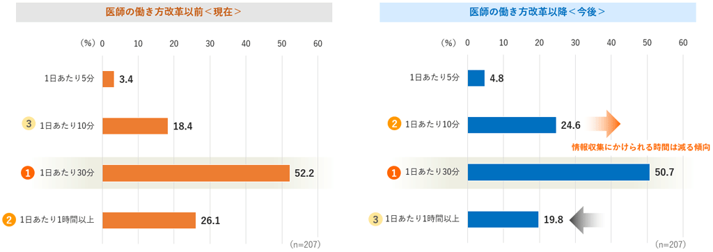 ●「医師の働き方改革」による情報収集にかけられる時間の変化について
